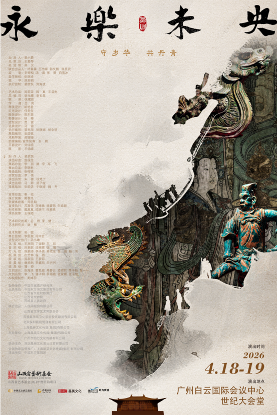 《永乐未央》以首批全国重点文物保护单位山西芮城永乐宫为题材,以20世纪50年代因修建三门峡水利工程,永乐宫迁建、近千名工匠与青年建设者以十年心血复原为叙事主线,在跨越七百余年的时空对话中,串联起“古建、壁画、琉璃、传承”四重美学维度的四个段落,全剧分为四个篇章:“筑广厦”“绘至境”“炼釉心”“承光阴”。与舞剧相呼应,“入画山西”主题壁画巡展将于各演出站点同期举办。