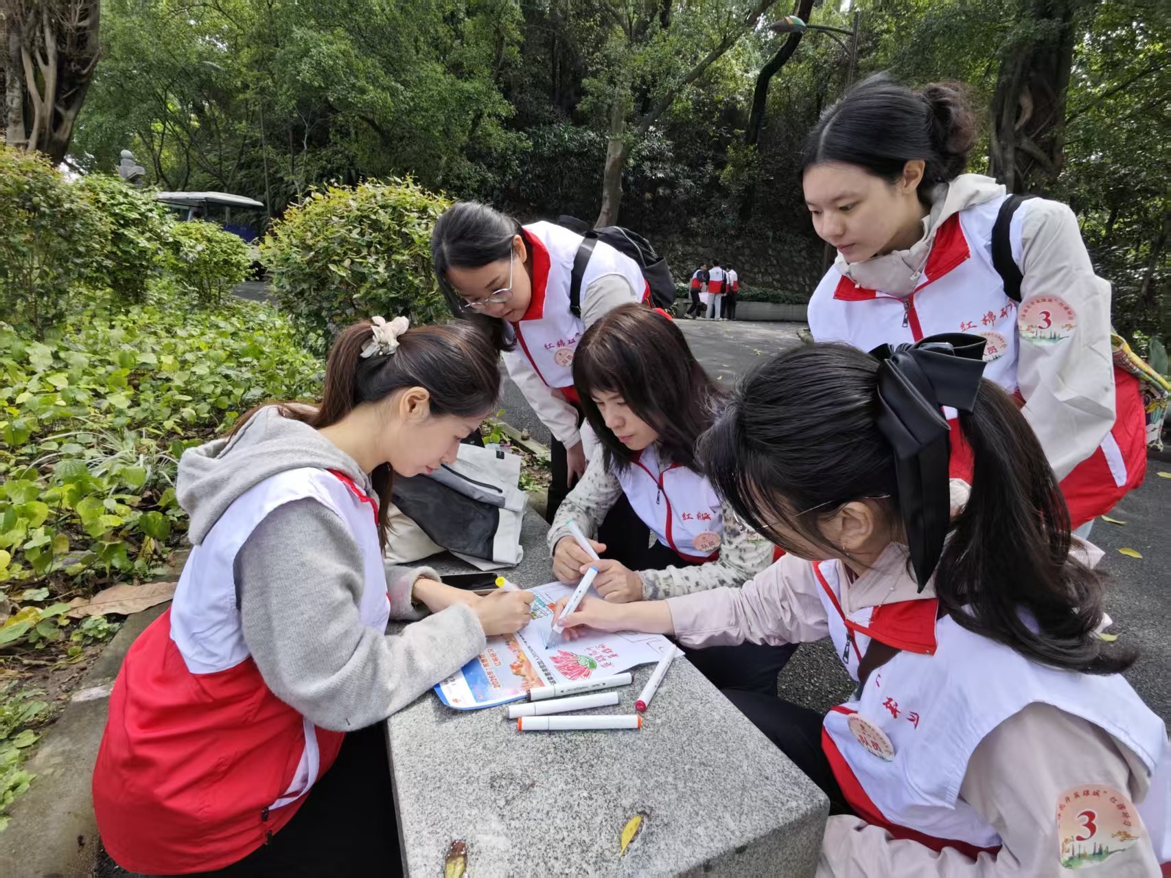 在白云山上,另一堂思政课也在进行。40名中小学生站在红棉树下,共同绘制一幅10米长卷。广场上,树木间悬挂着学生们写的红棉诗词,形成了一棵棵“诗词树”。现场发放的《广州中小学生红棉诗文精选》里,收录了孩子们自己写的诗。一位老师感慨:“以前是教他们读诗,现在是他们自己写诗。写出来的东西,比背下来的记得更牢。”